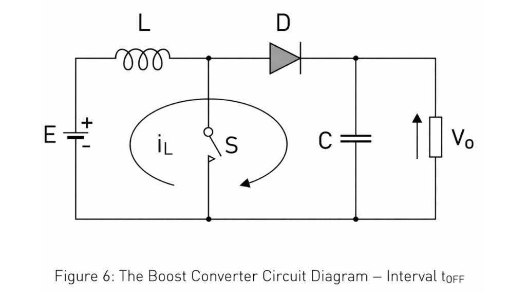 Now, the inductor current flows through the diode, capacitor, and load. The energy stored in the inductor during the ON interval is released and added to the input voltage. As a result, the output voltage becomes greater than the input voltage.