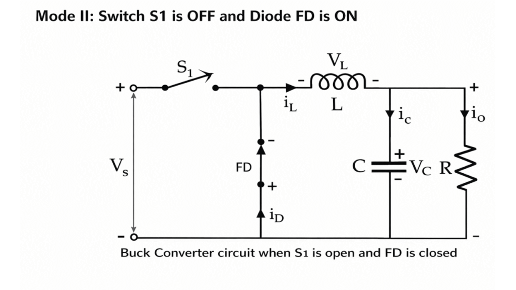 In this mode, the switch S is turned OFF and the diode D becomes forward biased. The energy stored in the inductor during the ON interval is now released to the load through the diode.
