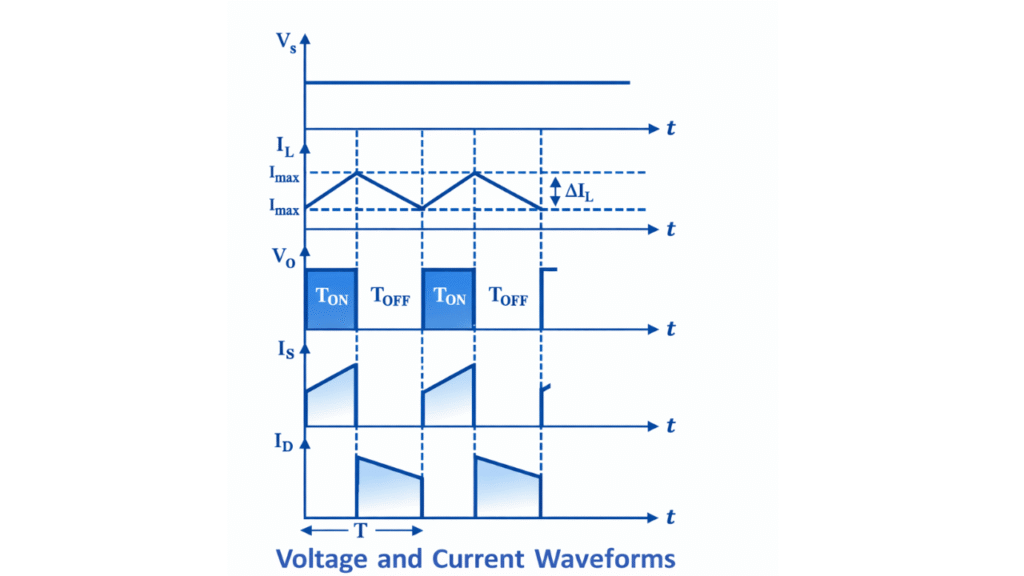 - Freewheeling diode (FD) – provides current path during OFF interval
