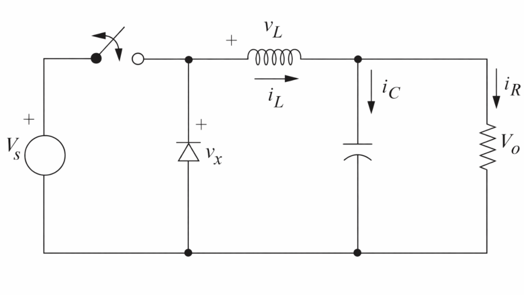 - DC input source (Vs) – supplies constant input voltage