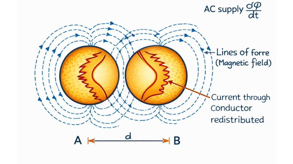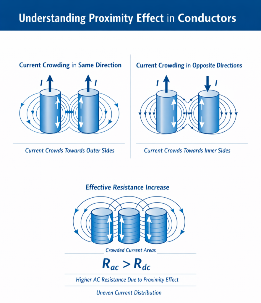 In alternating current (AC) systems, current distribution inside conductors is not always uniform. Apart from skin effect, another important phenomenon that affects conductor performance is the Proximity Effect.