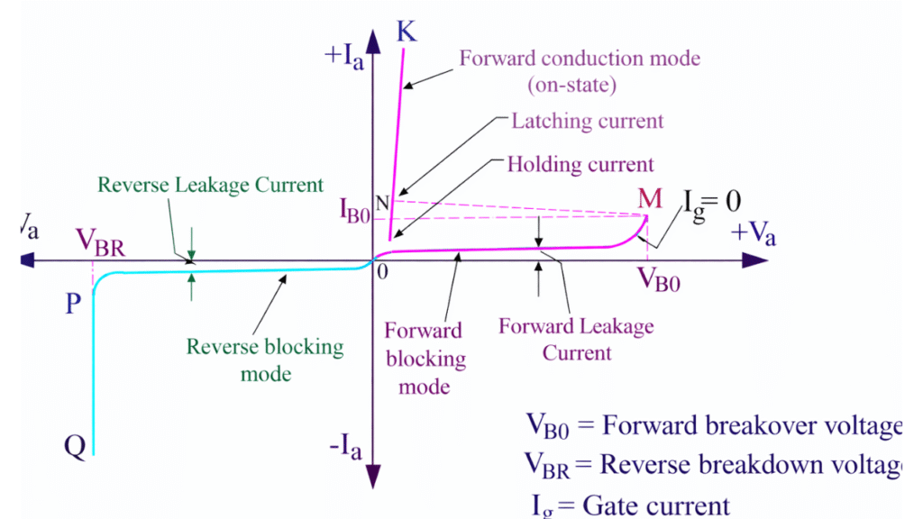 | Forward Conduction Region | Anode positive and gate triggered | All junctions forward biased | ON | Low forward voltage drop (≈ 1–2 V); heavy anode current flows |