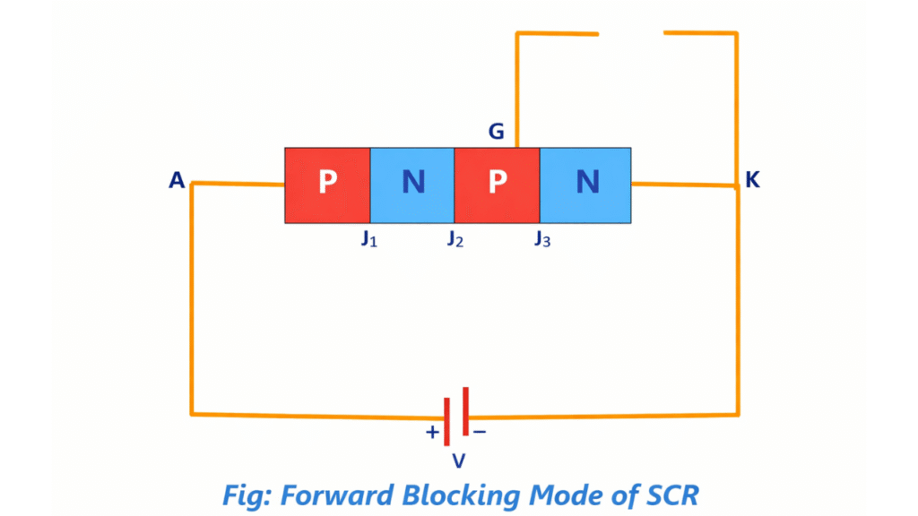 Due to the reverse-biased central junction J2, the SCR remains in the OFF state and blocks the forward current. Only a small forward leakage current flows. In this condition, the SCR behaves like a forward-biased diode with high resistance.