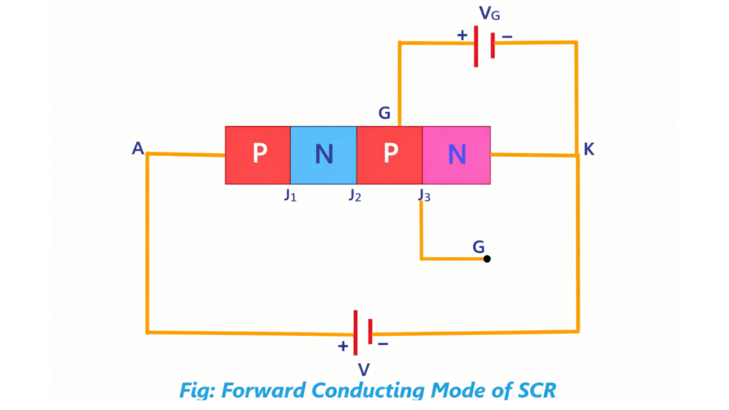 As a result, all three junctions become forward biased, and the SCR switches to the ON state. The device now offers low forward resistance and conducts heavily from anode to cathode.