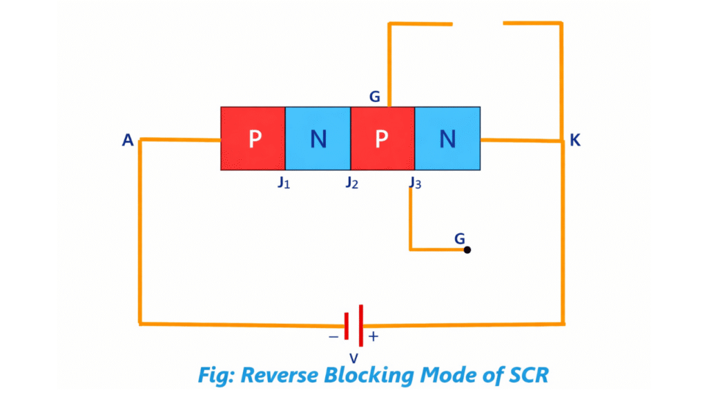 Since two of the three junctions are reverse biased, the SCR offers high reverse resistance and blocks the flow of current. Only a small reverse leakage current flows through the device.