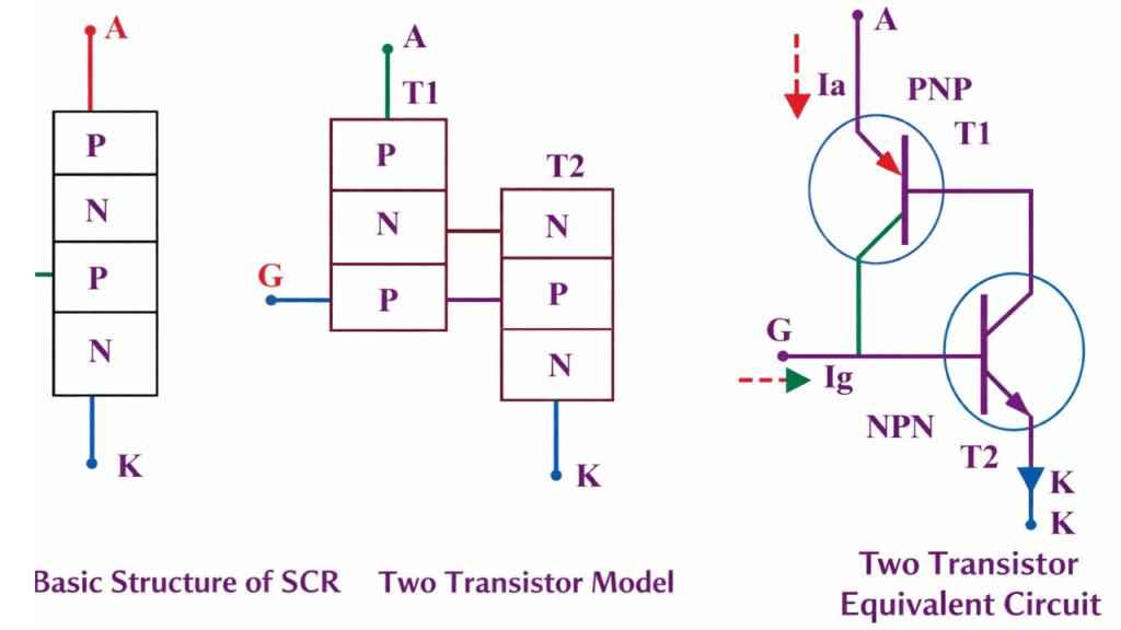 The device structure results in a tightly coupled regenerative feedback mechanism between two internal transistors: a PNP transistor and an NPN transistor. This internal transistor model explains the latching and switching behavior of the SCR.
