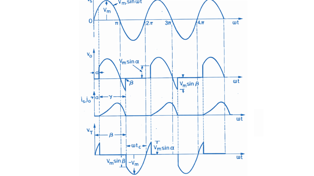 During this interval, the output voltage becomes negative while the load current remains positive. The stored energy in the inductor is gradually released and the current decreases slowly. Conduction continues until the current decays to zero at the extinction angle , where . At this point the current falls below the holding current and the SCR turns OFF naturally. This process is called natural commutation.