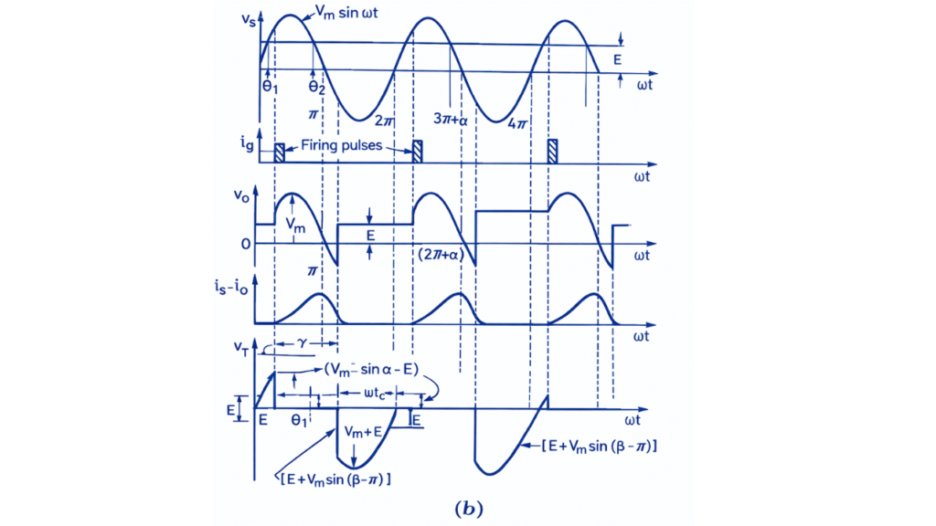 Hence, the average output voltage over one cycle isVdc=12π[αβvsd(ωt)+β2π+αEd(ωt)]V_{dc} = \frac{1}{2\pi} \left[ \int_{\alpha}^{\beta} v_s \, d(\omega t) + \int_{\beta}^{2\pi+\alpha} E \, d(\omega t) \right]
