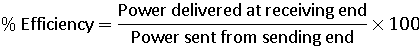 Efficiency indicates how effectively electrical power is transmitted from the sending end to the receiving end. It is defined as the ratio of power received at the load end to the power supplied at the sending end.