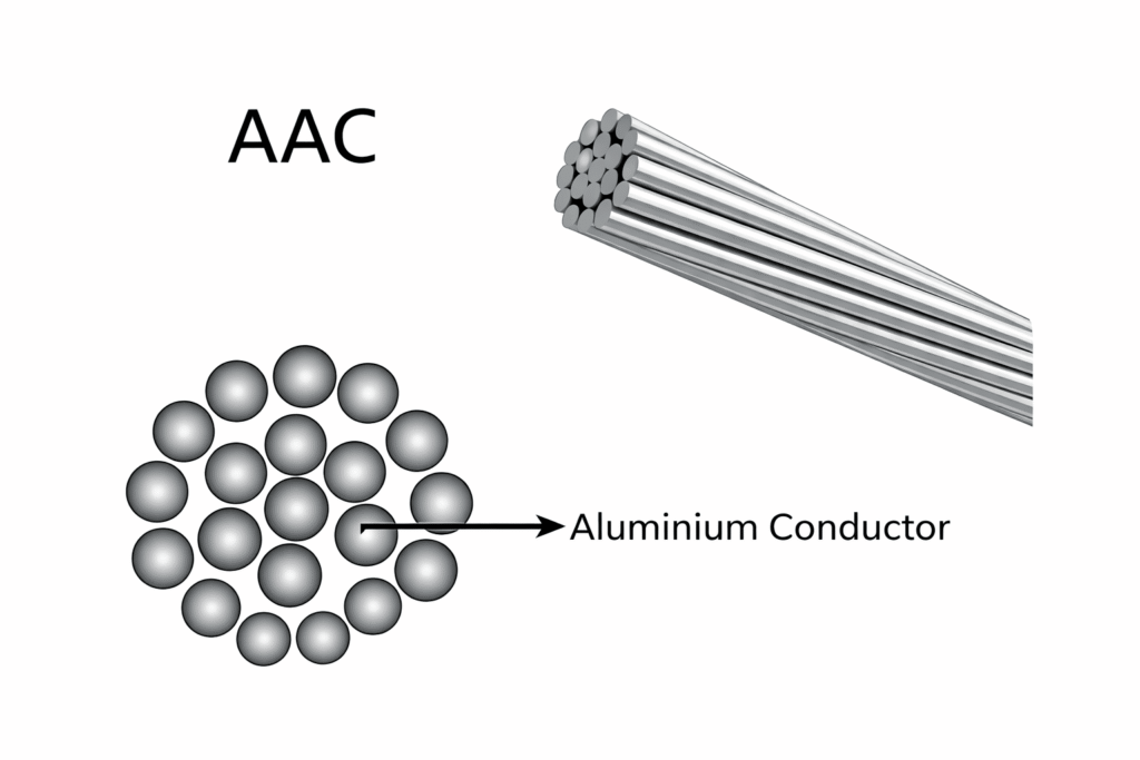 AAC is made of pure aluminium strands twisted together. It offers good conductivity but low mechanical strength, making it suitable only for short spans. These conductors are commonly used in urban distribution networks and low-voltage transmission lines. AAC is light in weight and easy to install.