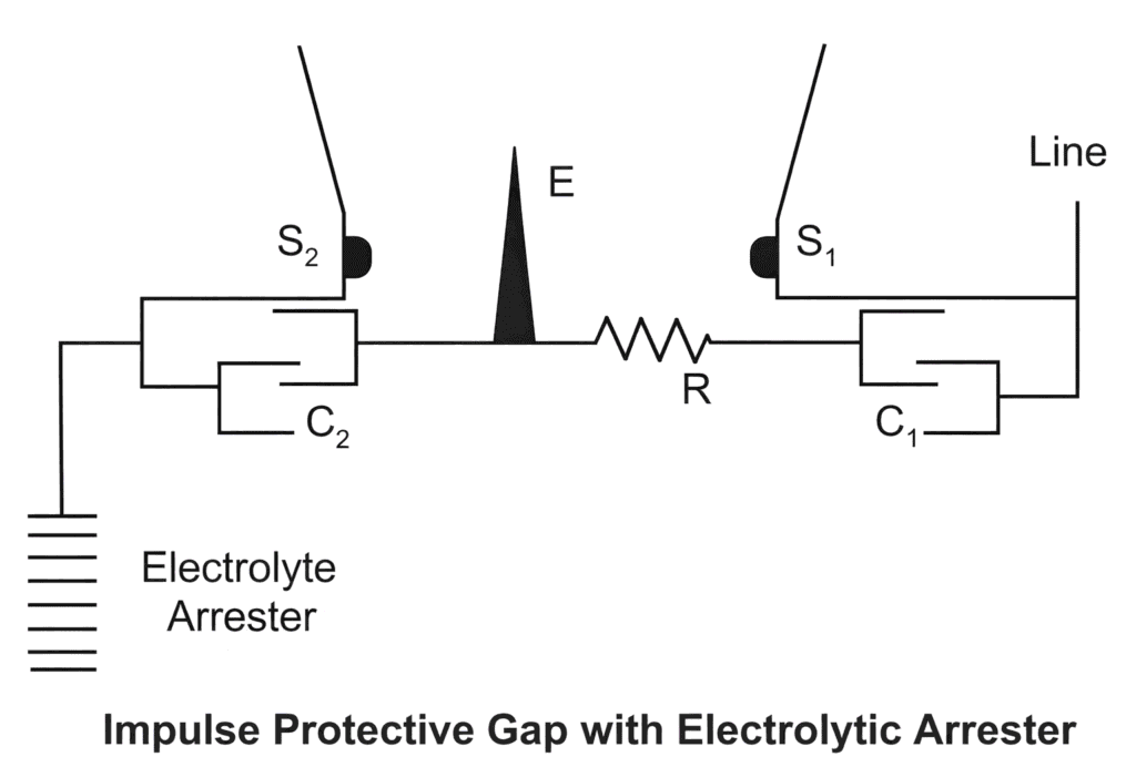 The impulse protective gap is designed to operate efficiently under steep lightning impulses. It consists of two main sphere electrodes S₁ and S₂, an auxiliary electrode, capacitors C₁ and C₂, and a resistor R.
