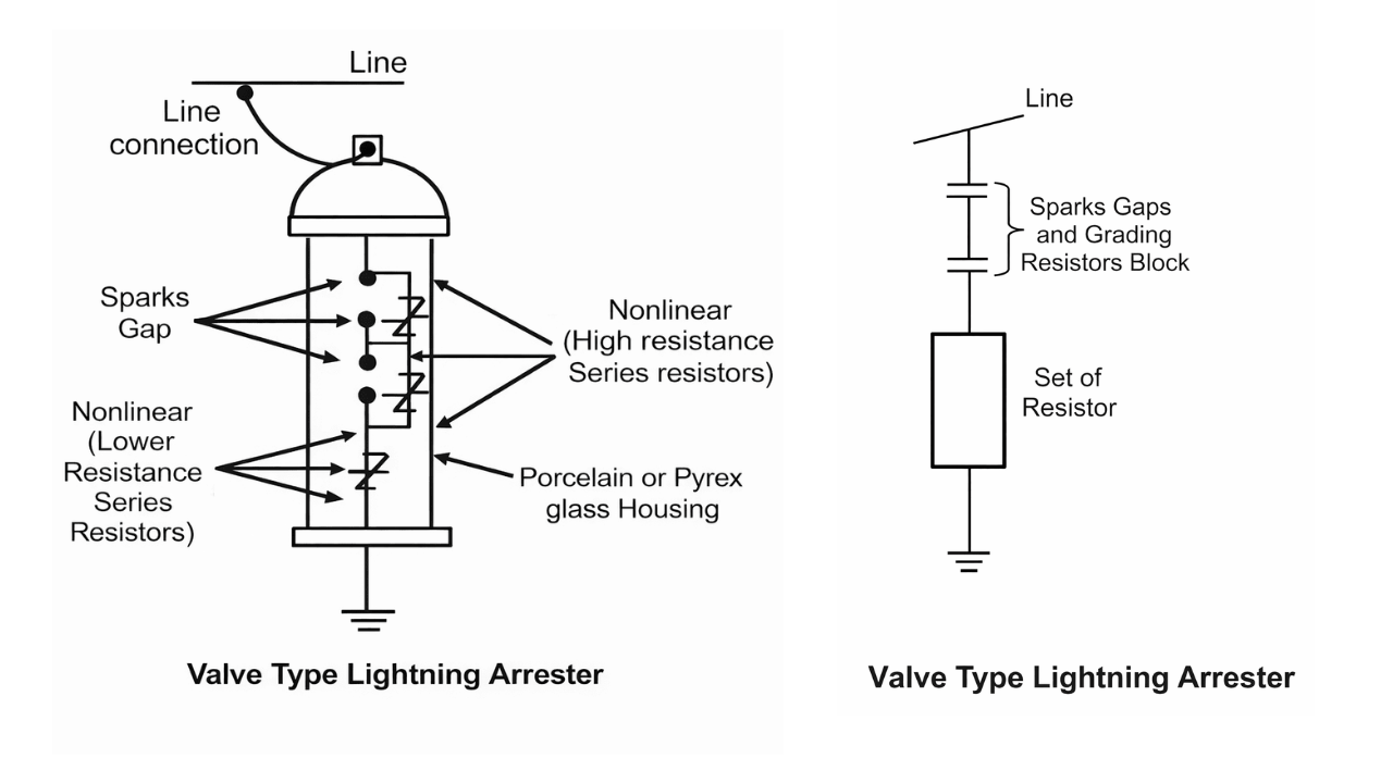 Valve type arresters use nonlinear resistors in series with spark gaps. The spark gaps are divided into several sections, each having grading resistors connected in parallel.
