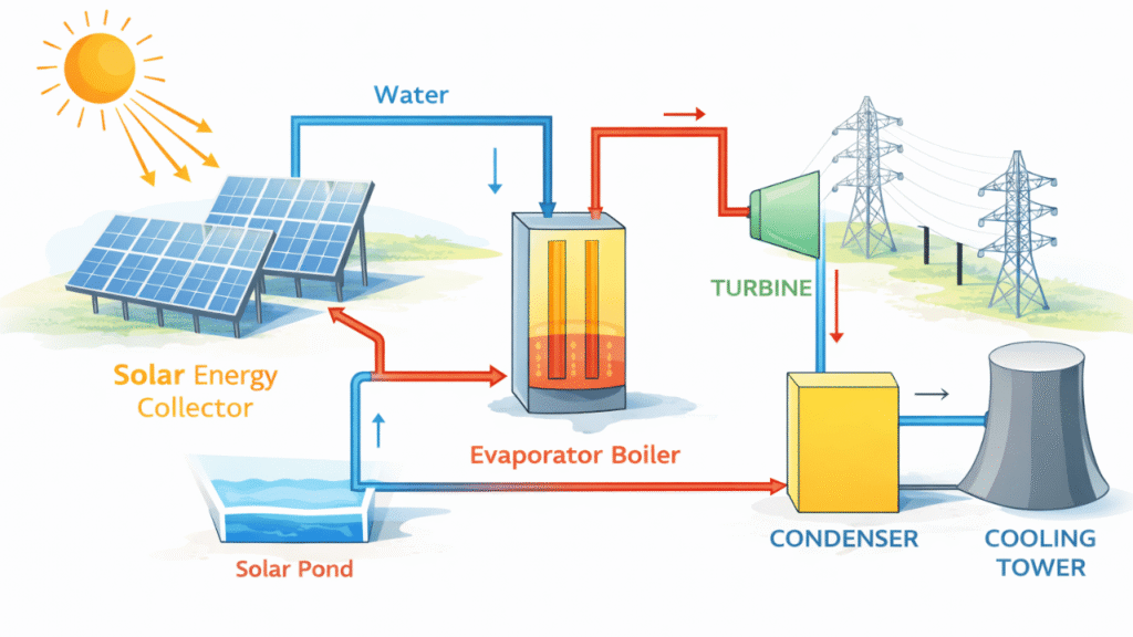 This method follows the same working principle as conventional thermal power plants, with solar energy replacing fossil fuels as the heat source.