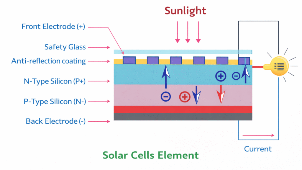When sunlight falls on the surface of a solar cell, photons strike the semiconductor atoms and transfer their energy to the valence electrons. As a result, electrons gain sufficient energy to break free from their atomic bonds and move into the conduction band.