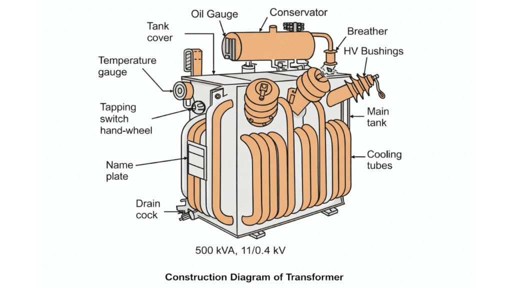 - Conservator Tank: A small tank located above the main tank. It allows the oil to expand and contract with temperature changes without exposing the main tank to air.